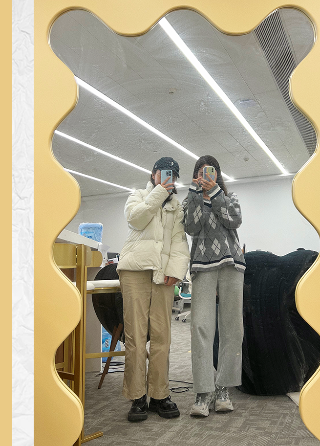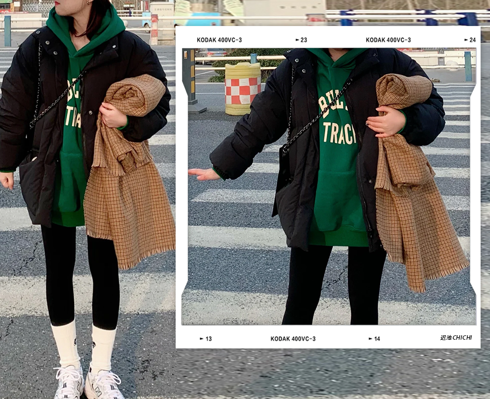 如果不是紙片人身材,內搭一定要選修身款!因為羽絨服本身就自帶膨脹效果,如果裡面再穿得鼓鼓囊囊,就會讓人看起來非常臃腫!