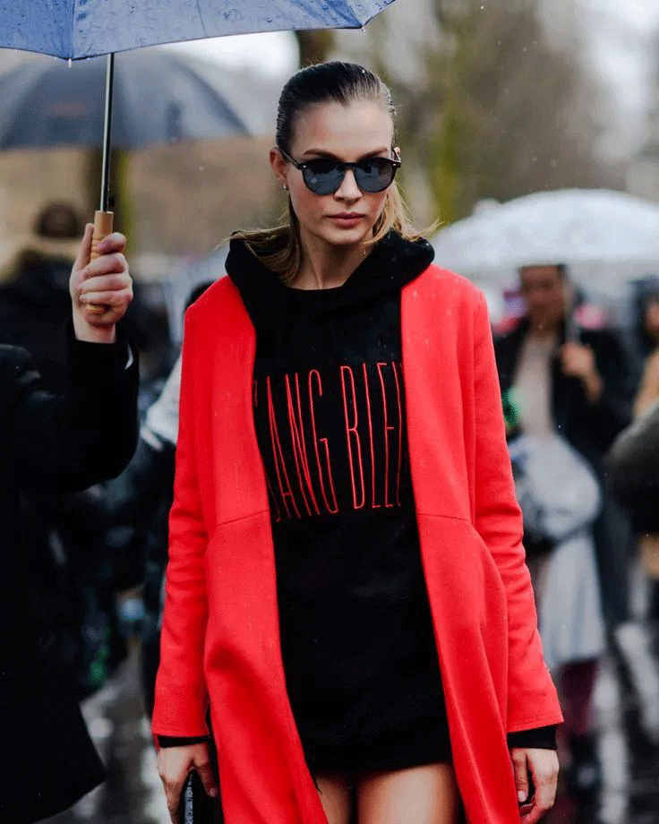 需要注意的是,選擇帶帽衛衣和無帽衛衣最大的區別就是對脖頸處的修飾。帶帽最大的好處是穿著無領衣服例如說像風衣或者大衣類單品時,可以起到很好的修飾作用,能修飾肩寬,看這個動圖就比較明顯。