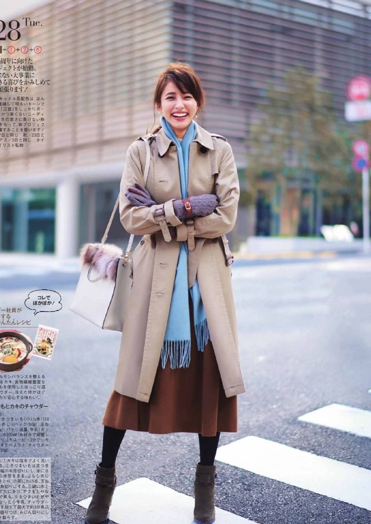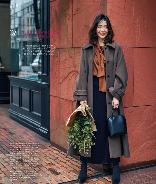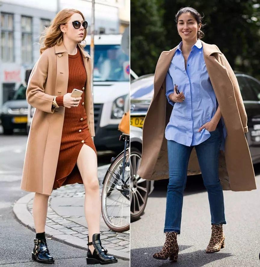 駝色飄帶襯衫+黑色迷笛裙+黑色靴子+大衣:相較基礎款襯衫,有設計感的飄帶襯衫時髦屬性更強,不需要搭配技巧既能自成一體,自帶女生味。搭配褲裝職場幹練,搭配裙裝知性優雅。