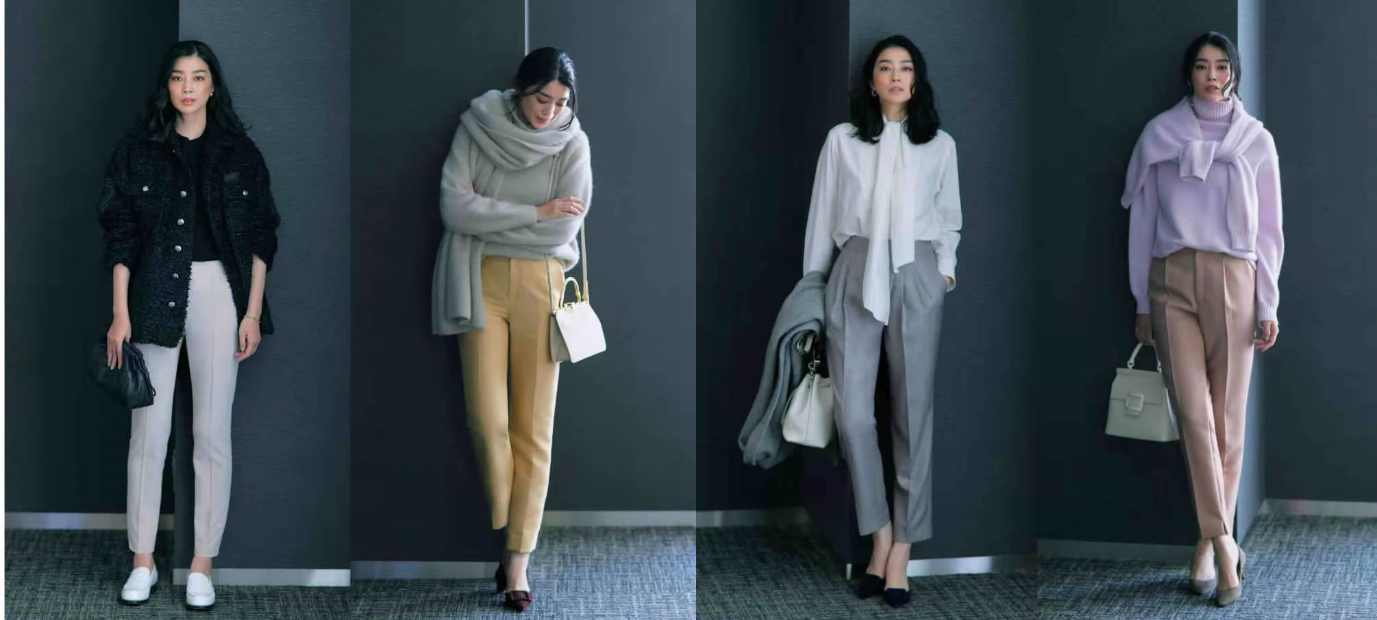 對比下面3套搭配,九分褲長的優勢格外鮮明。保持挺括有型,筆直的中縫線就是凜然態度,剛毅不容侵犯,特別適合正式或利落表達。