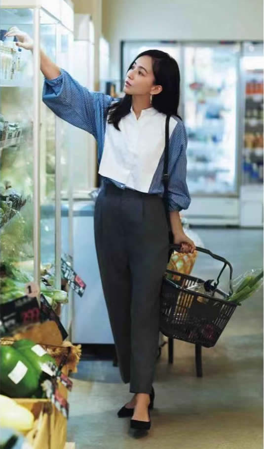 喜歡穿平跟鞋,或者休閒鞋,不能從鞋子處調和時,不妨將眼光往上移吧。用超高的高腰線,提升長褲的整體比例,不失睿智之舉。
