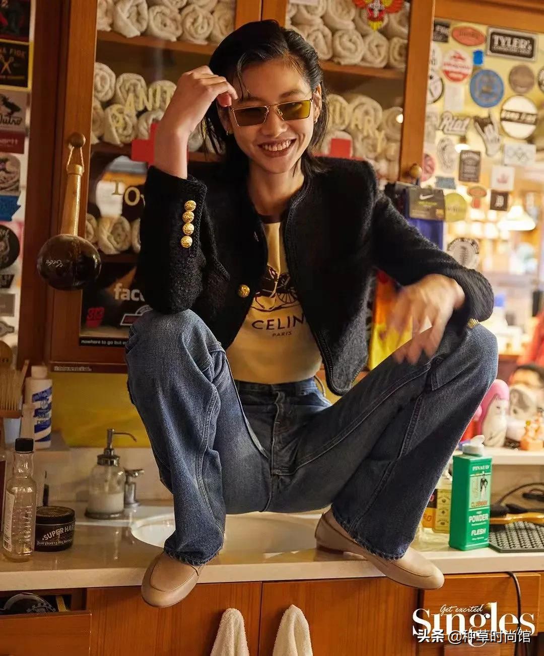 女生的配飾比較偏中性風,因此整體look很有氣場,她的這支復古的茶色眼鏡,戴上就很有酷girl內味。