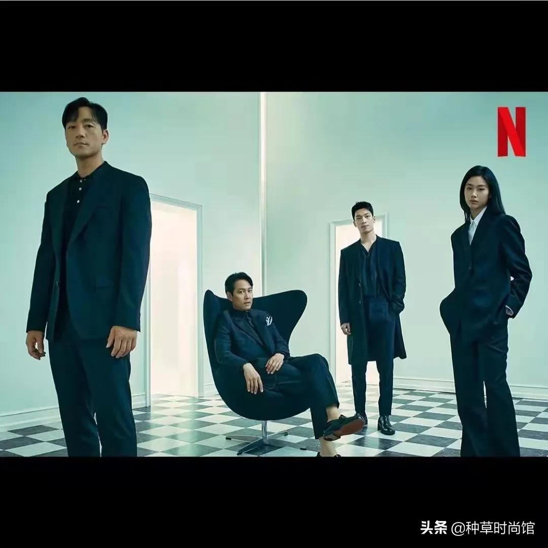 她穿上酷感十足的西服套裝,帥氣有型,氣質直逼三位男演員。