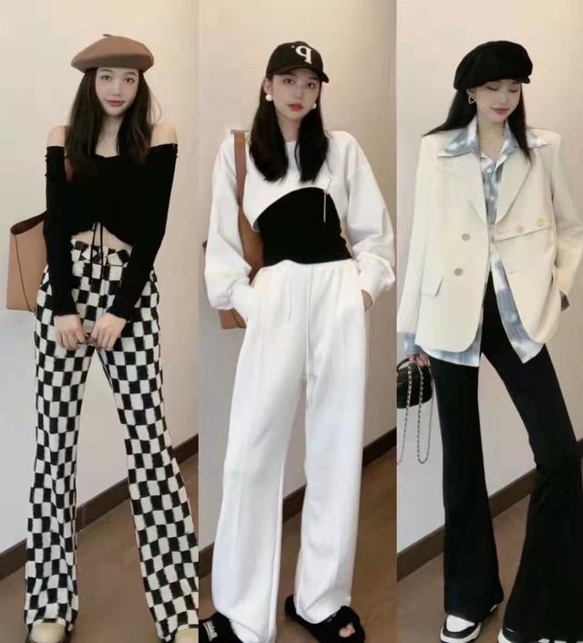 時尚女生的搭配一般都與當下的時尚潮流結合,例如棋盤格版型的喇叭褲,搭配露肩的上衣,打造出淑女的氣質和街頭的時尚感。