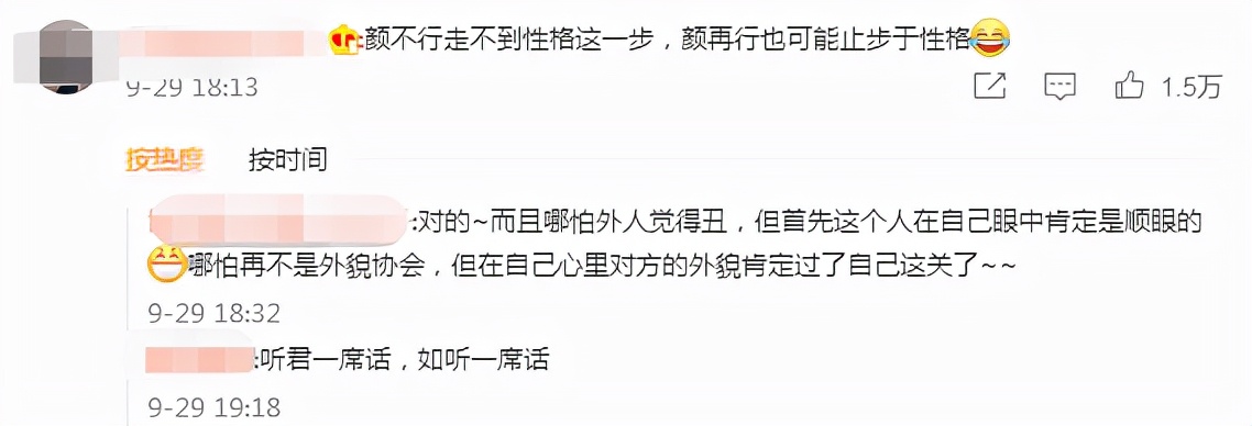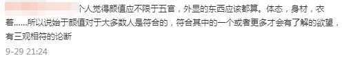 「個人覺得顏值應不限於五官,外顯的東西應該都算。體態,身材,衣著……所以說始於顏值對於大多數人是符合的,符合其中的一個或者更多才會有了解的欲望,有三觀相符的論斷。」