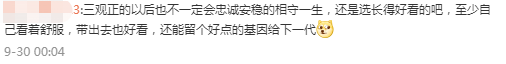 「三觀正的以後也不一定會忠誠平穩的相守一生,還是選長得好看的吧,至少自己看著舒服,帶出去也好看,還能留個好點的基因給下一代。」