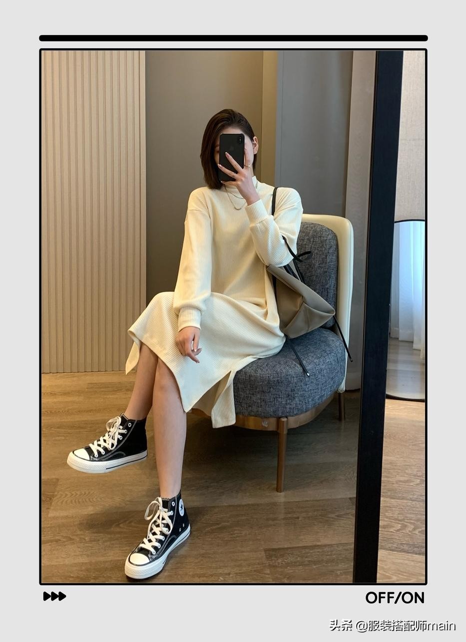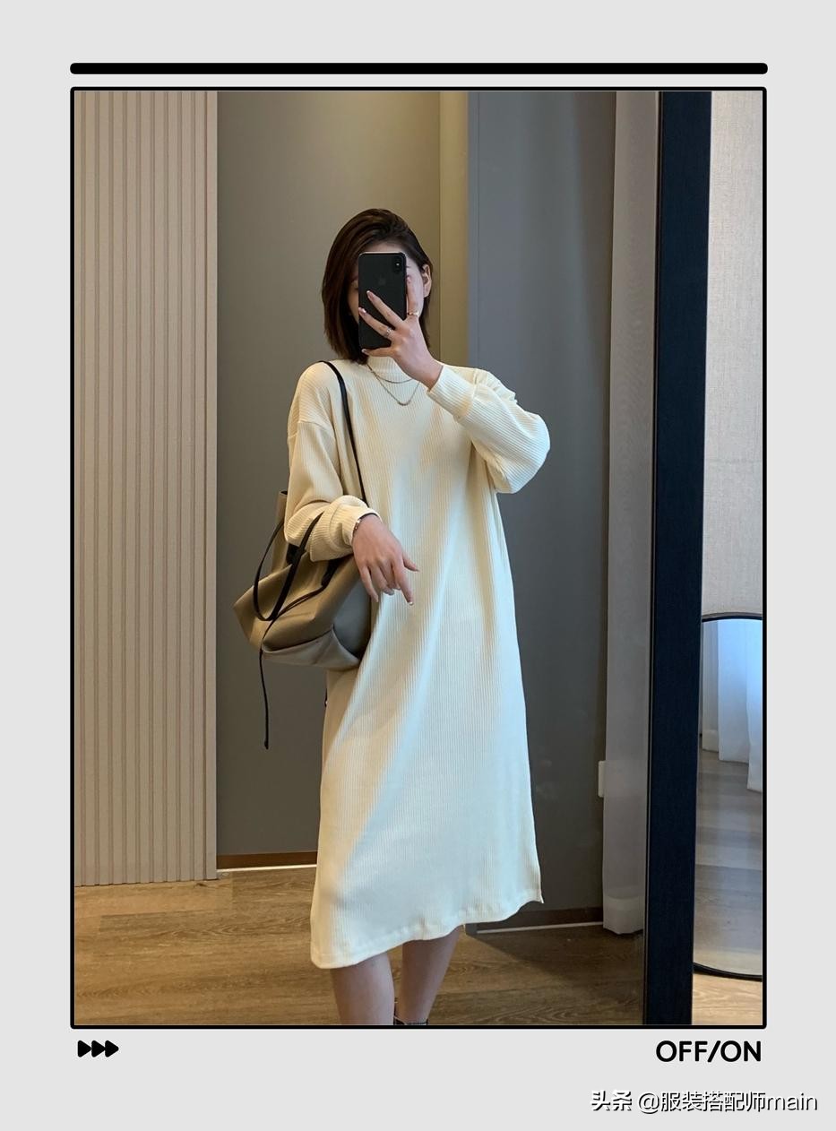 不喜歡深色的姐妹,就來看看這一款米白色,這條針織裙版型就很寬鬆,不管是梨形身材還是蘋果型身材都能藏起來。