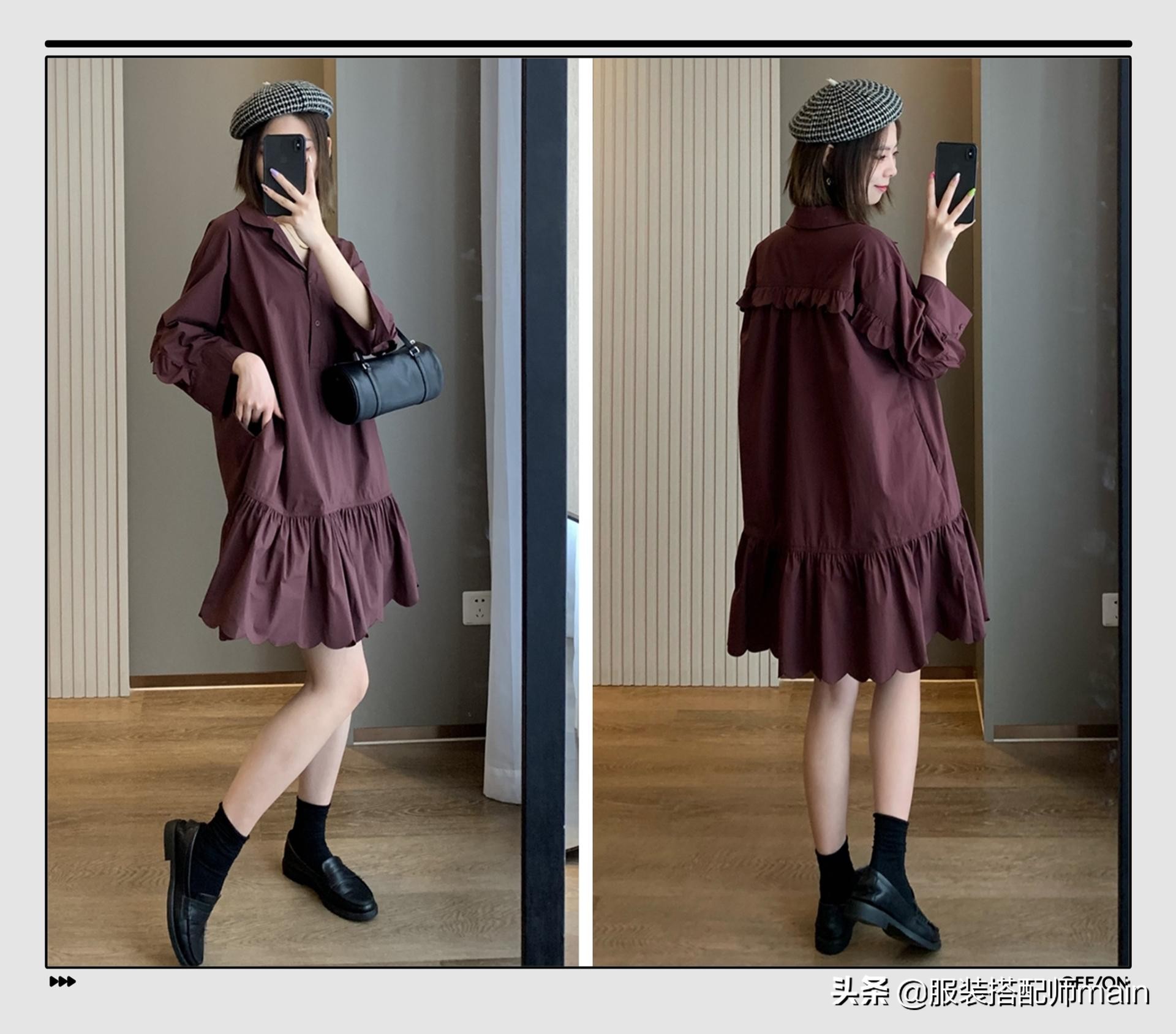 這條葡萄酒紅的襯衫裙則是相反風格的,有種蓬蓬裙的感覺,穿上去很少女,元氣值也UP了。