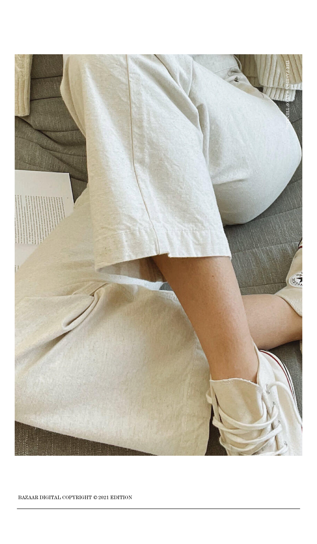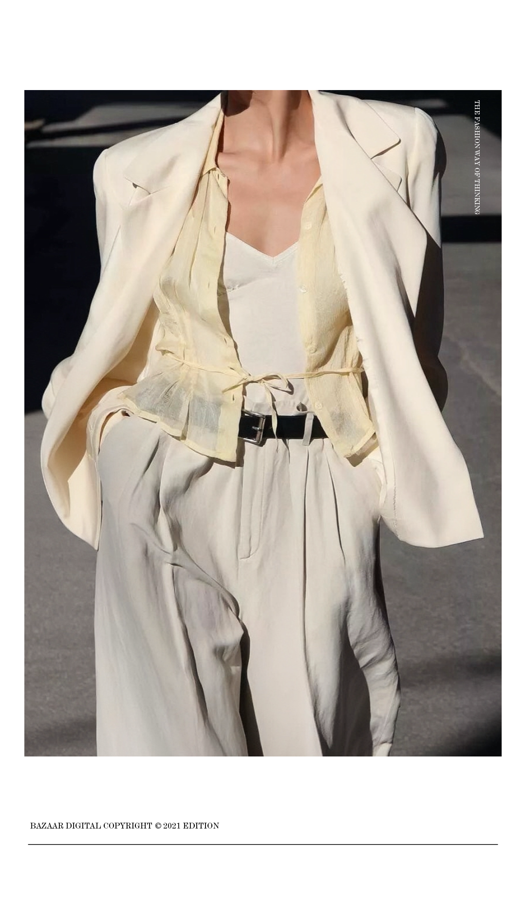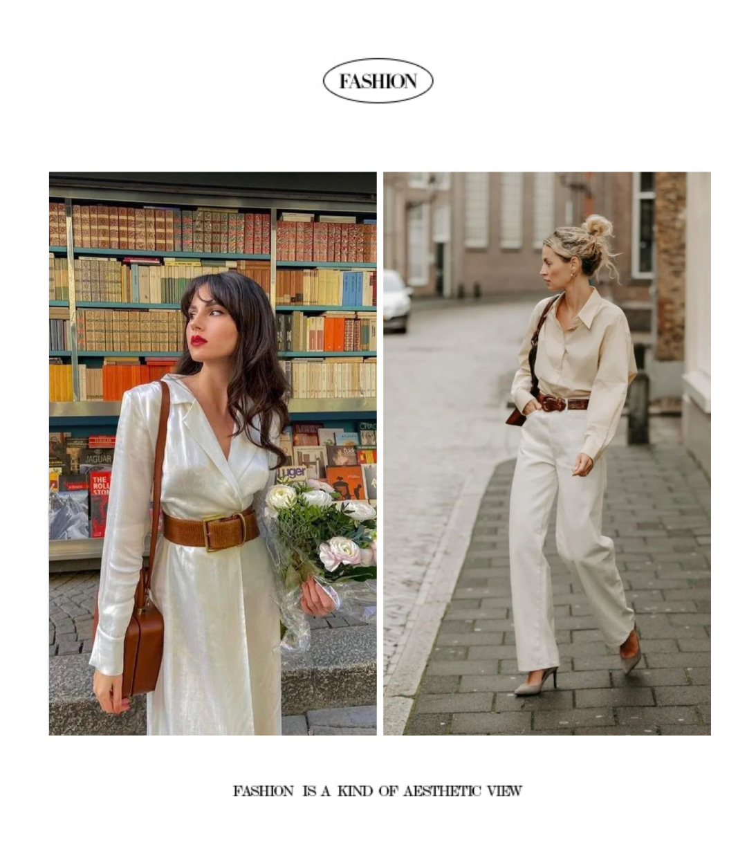搭配褲裝時需要注意腰線,復古棕色腰帶就是一個不錯的搭配,跟奶油色的慵懶感相得益彰。