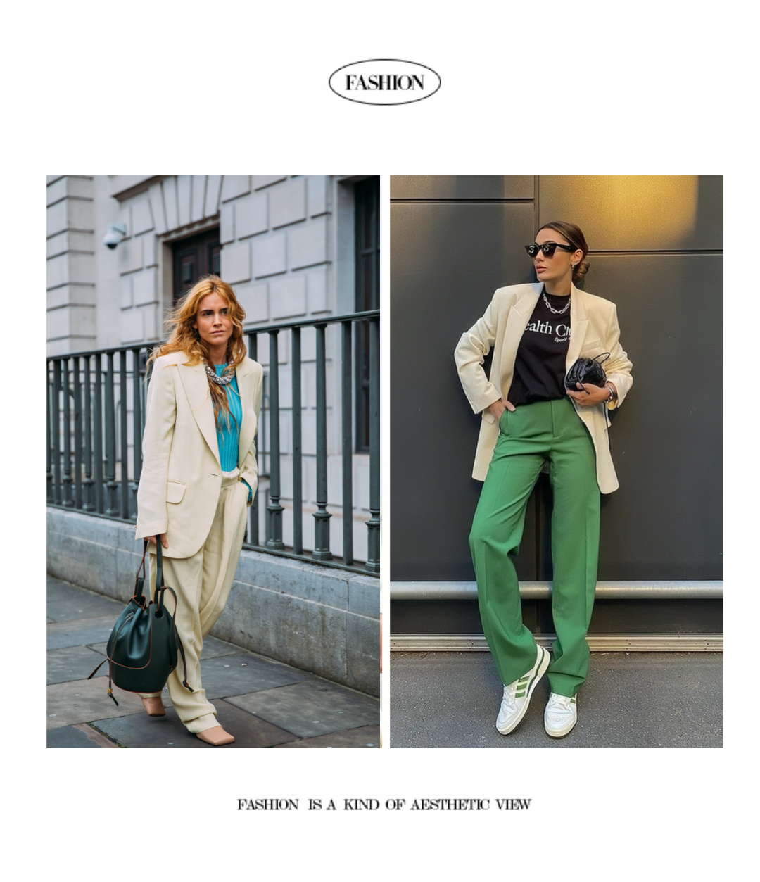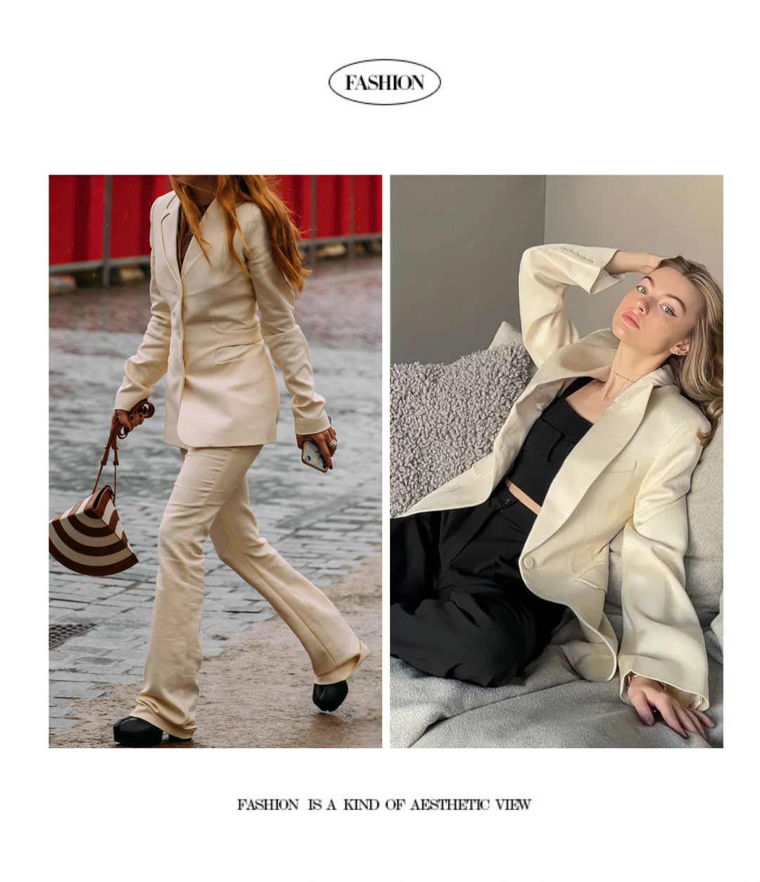 如果你衣櫥中有亮色系衣服不知道怎麼搭,試試與奶油色西裝組合吧,絕對簡單不出錯~