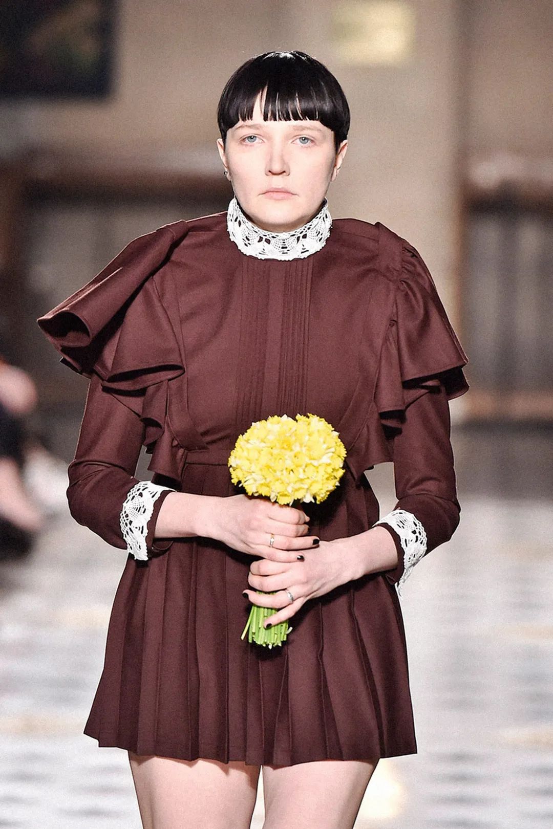 這場本來是線上秀,沒有邀請嘉賓到場,但他找來了一堆「演員」,現場「克隆」一個疫情前的秀場,「嘉賓」們全程高舉手機對準模特,而模特們則是一副消極怠工的樣子,乾脆蒙面出場。