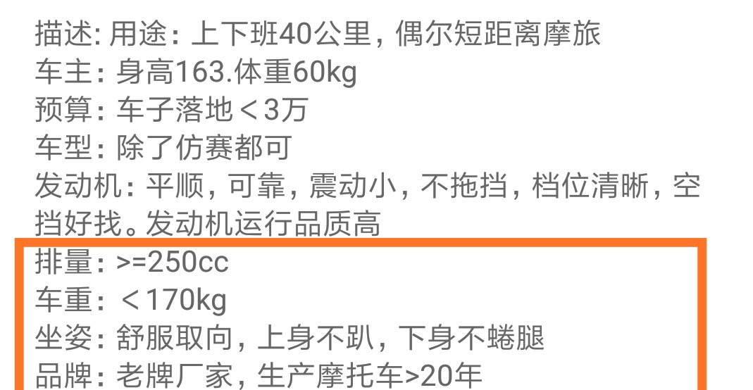 我們先來看一下個人介紹,從描述得知題主身高163cm,體重60kg,以駕馭車型的標準來看身體條件沒有太大的優勢,基本上只能在一些低座高車型中進行尋找。
