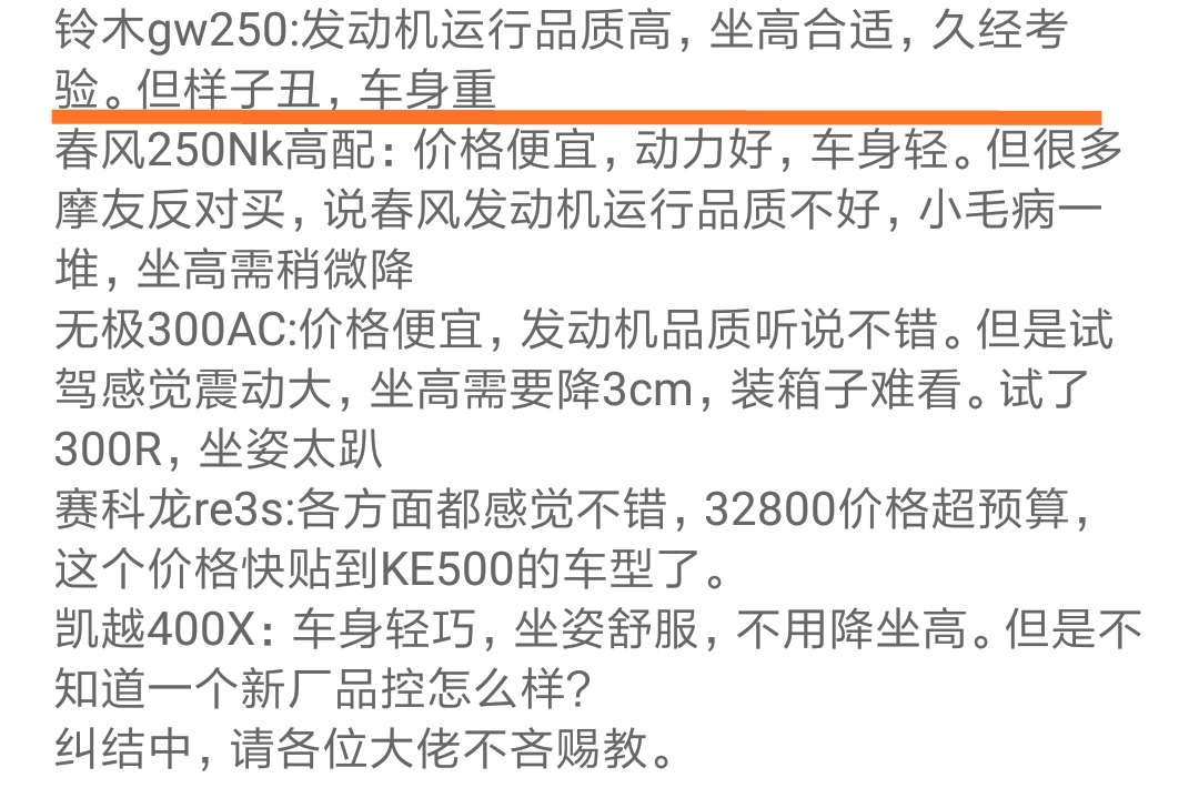 再來看一個題主的目標車型GW250​​,春風250NK,無極300AC,賽科龍RE3,凱越400X,以這幾款車型的表現來看,GW250是最適合題主的,但因為這款車有的人老珠黃,不夠嫵媚所以第一個被題主給淘汰掉了。