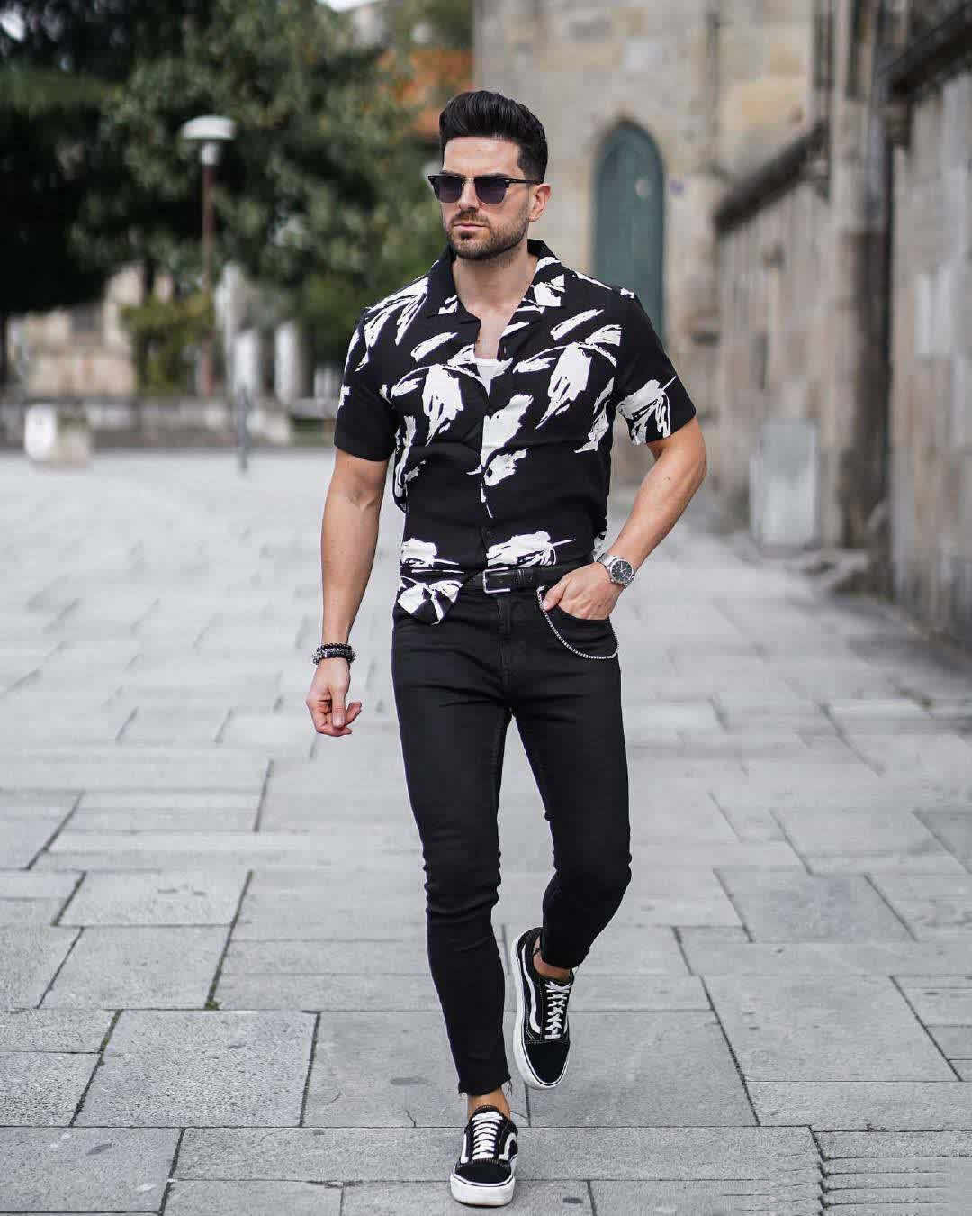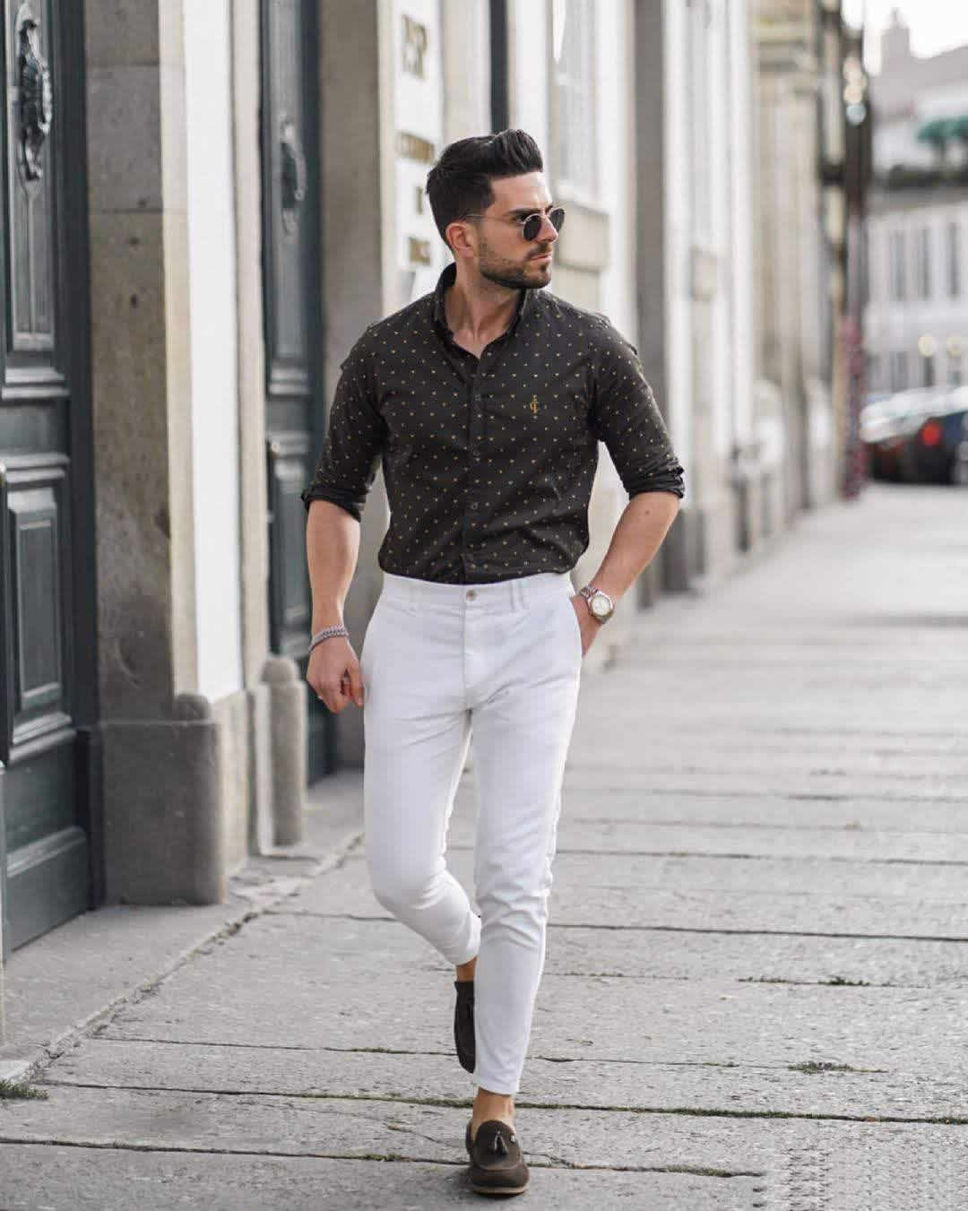 ↑波點襯衫+小白褲,白色的清爽最符合夏天的調性了。黑色與金色大氣又高貴的配色襯衫是男人們高傲姿態的最佳代表色,這樣的一對組合得體大方。穿出高品位與高地位,一看就是有品的男人。帥氣又時尚,休閒調調永遠都是穿搭主潮流。