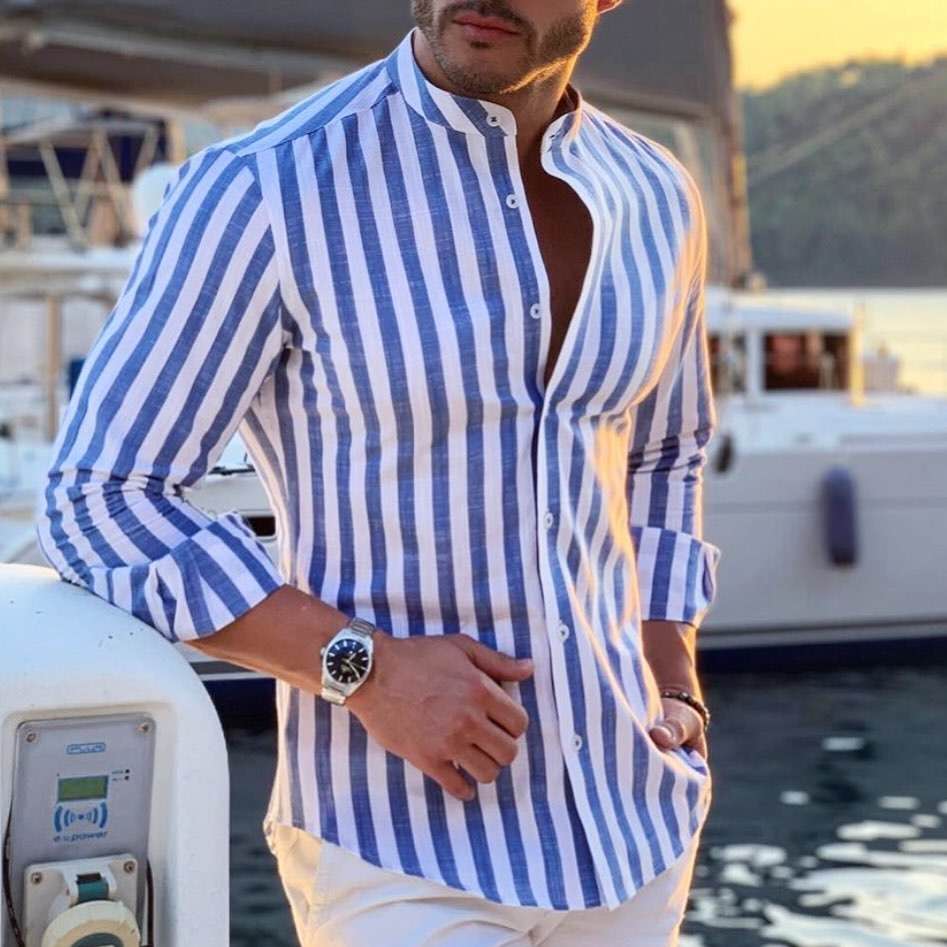 ↑條紋襯衫+深藍短褲,明顯的「爸爸風」,這兩樣單品是男人衣櫥中的經典,很適合夏季穿搭。一件新潮的條紋拼色襯衫,大氣明亮的配色在一眾黑白灰的衣服裡格外出挑醒目。只需要配一條深藍短褲就能彰顯男人的魅力了。穿上小白鞋,打造街頭慵懶風,成熟有魅力。