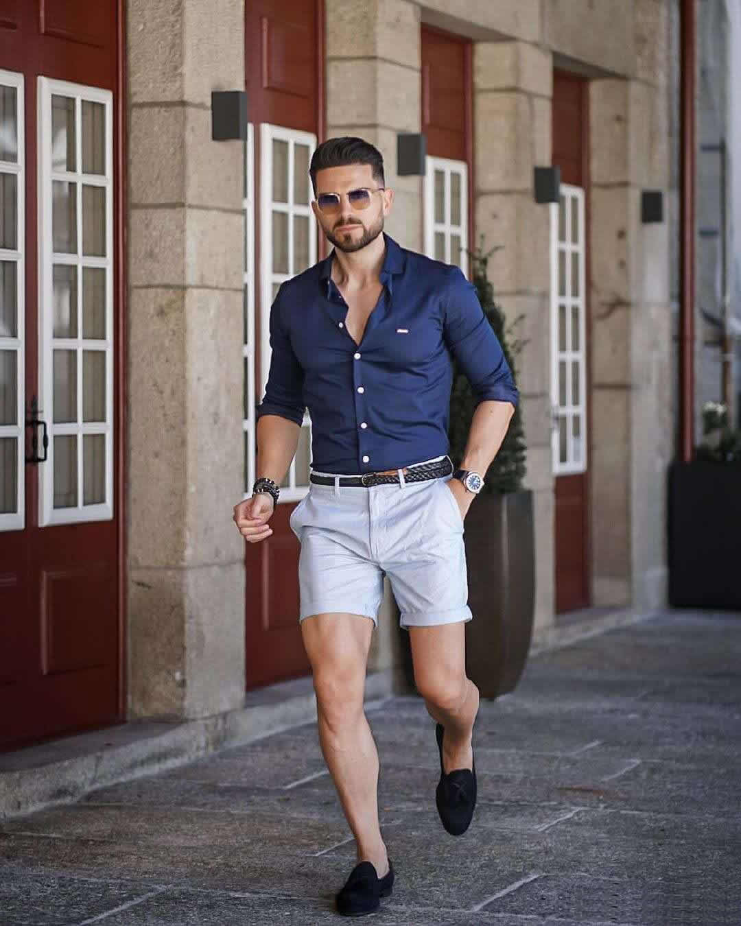 ↑藍色襯衫+淺灰短褲,對於成熟穩重的男人來說,深藍色同樣是非常友好的顏色之一。它的沉穩高級正好匹配男人們的穩重。而穩重對於男人來說非常非常重要,它是可靠、信得過的象徵,對家人、朋友、上級主管、下屬,讓別人信得過,你就贏了。