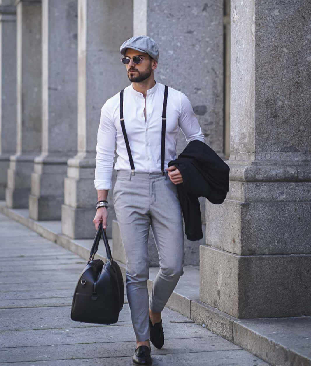↑白襯衫+灰色背帶褲,這一套白與灰組合,藝術文雅氣息十足。純淨的白與高級灰為主,輔以經典的黑色,最顯高級。可調節背帶褲有著明顯的調性,給極簡註入層次與活力,富於變化的動感帶來無限的紳士魅力。