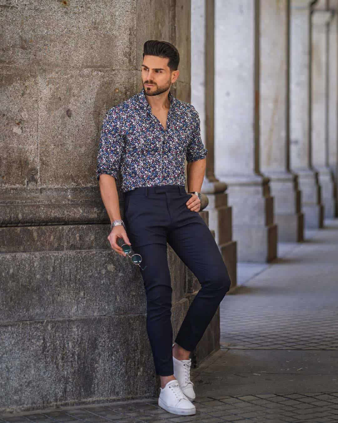 ↑碎花襯衫+小黑褲+小白鞋,小碎花襯衫對於男人們來說是非常迷人的一種圖案。他這件藍調為主的碎花襯衫帶著輕奢小品位,時髦還潮酷。搭配小黑褲和小白鞋,雅痞調性十足,體現出他不俗的衣品。