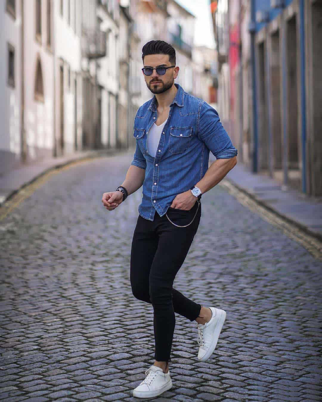 ↑牛仔襯衫+小黑褲+小白鞋,這一套搭配活力滿滿,極簡的黑與白配合牛仔藍呈現出乾淨、高級的搭配。牛仔襯衫的經典是不分男女的,男人們穿起來更加帥氣經典。