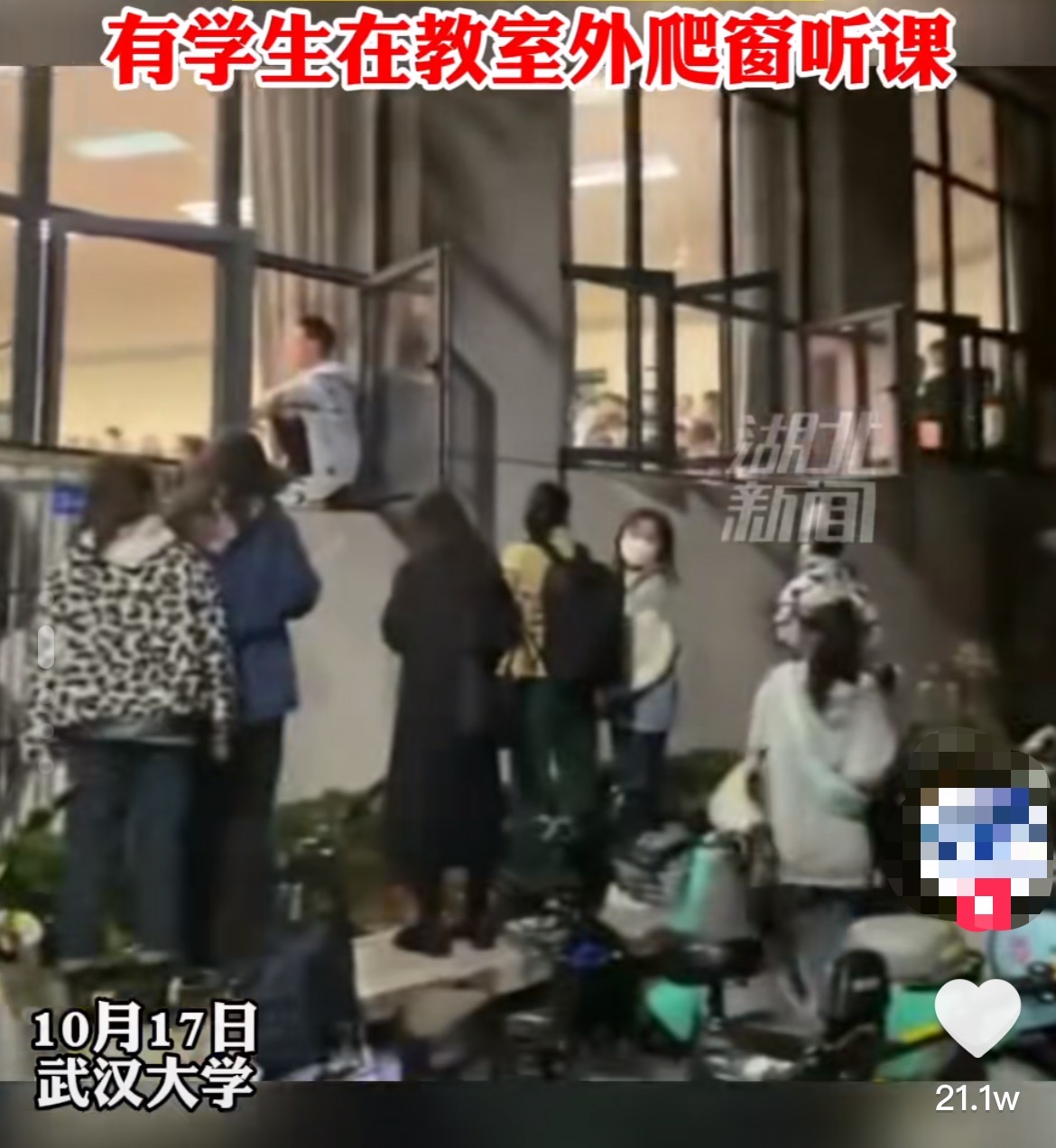 根據視訊顯示,開講前,教室內已經擠滿了人,一名女同學通過教室窗戶爬進教室聽課,此積極之舉引起教室內不小「轟動」,同學們一同大聲感嘆了起來,隨著大家的驚呼,女同學「亮」出自備的小板凳,如此用心,自然少不了大家熱烈鼓掌,接著,陸續有不少男同學也從窗戶進入教室,認真「補課」。