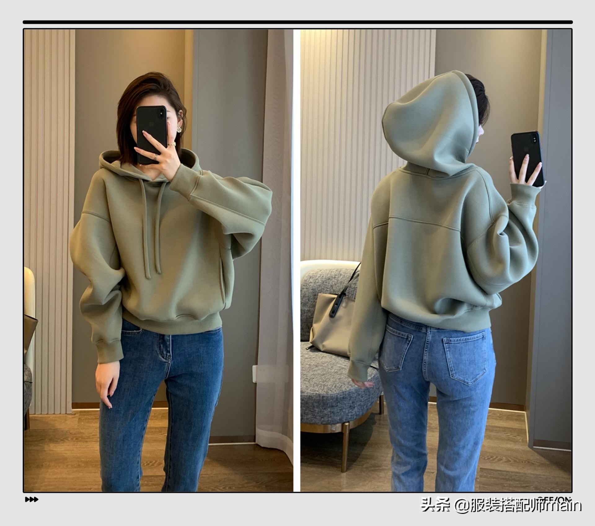 我們日常在選衛衣時有兩點需要注意:一是顏色不要花裡胡哨的,容易顯老氣。二是版型不要過於寬鬆,尤其是做內搭,修身一點的會很顯瘦。