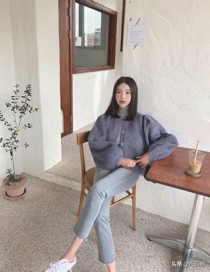 如果選擇內搭,你可以選擇疊搭加絨款牛仔外套或者皮毛一體的保暖外套,最外面的衣身長度只要超過針織開衫的衣身長度就是完美無瑕的!