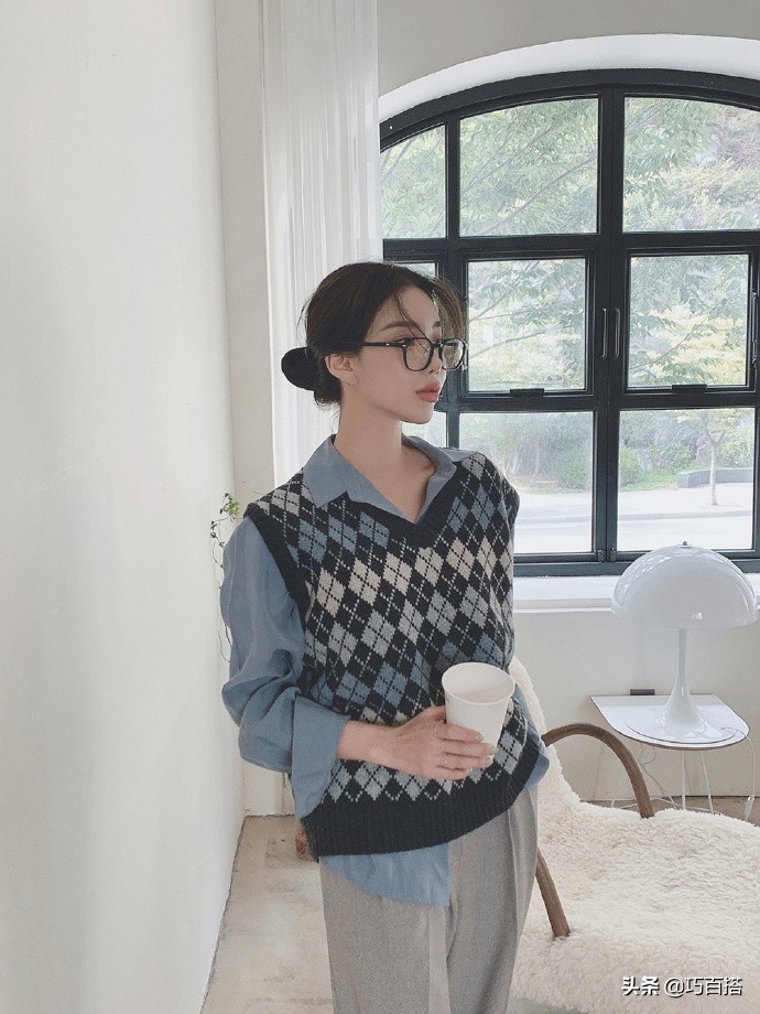 如果你感覺針織外套單穿或者疊穿容易顯老氣,也可以選擇博主身上這種菱形格紋款式的針織馬甲。