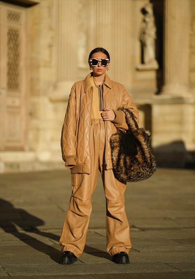 復古棕與皮面料的結合,便賦予了服飾更高級的款式特點。並且在套裝服飾的搭配作用下,添加波紋壓線設計凸顯出服飾的質感,同時還提升了時尚感,與同類別的褶皺感棕色闊腿皮褲搭配,更顯高級,有著滿滿的時尚韻味。
