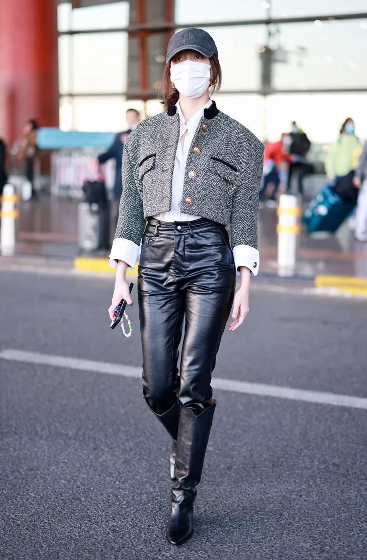 向來個性的宋妍霏怎麼會錯過彰顯態度的皮褲單品?同樣是粗花呢外套+皮褲的造型,她用棒球帽和長筒靴的搭配帶來氣場超強的壓迫感,相當有態度。