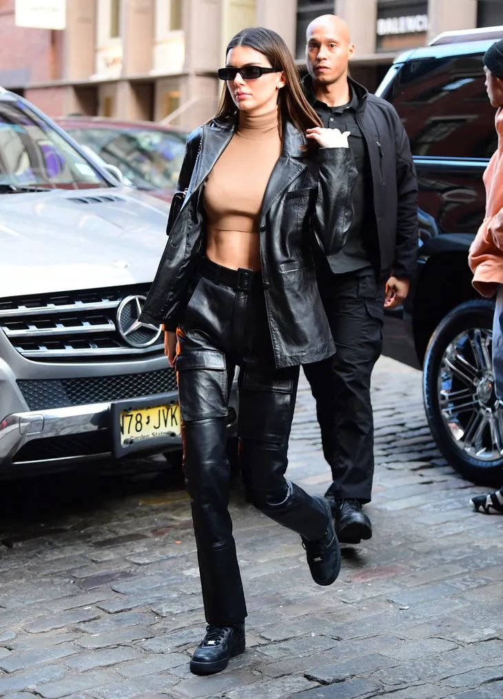 不難發現,女明星們對版型硬挺且極具個性的皮褲是敞開懷抱的。首先推薦腿長且胯窄的辣妹必須入手一條包臀直筒褲,臀部收緊,褲腿筆挺的設計有種颯爽又帥氣的質感,無比顯腿長。