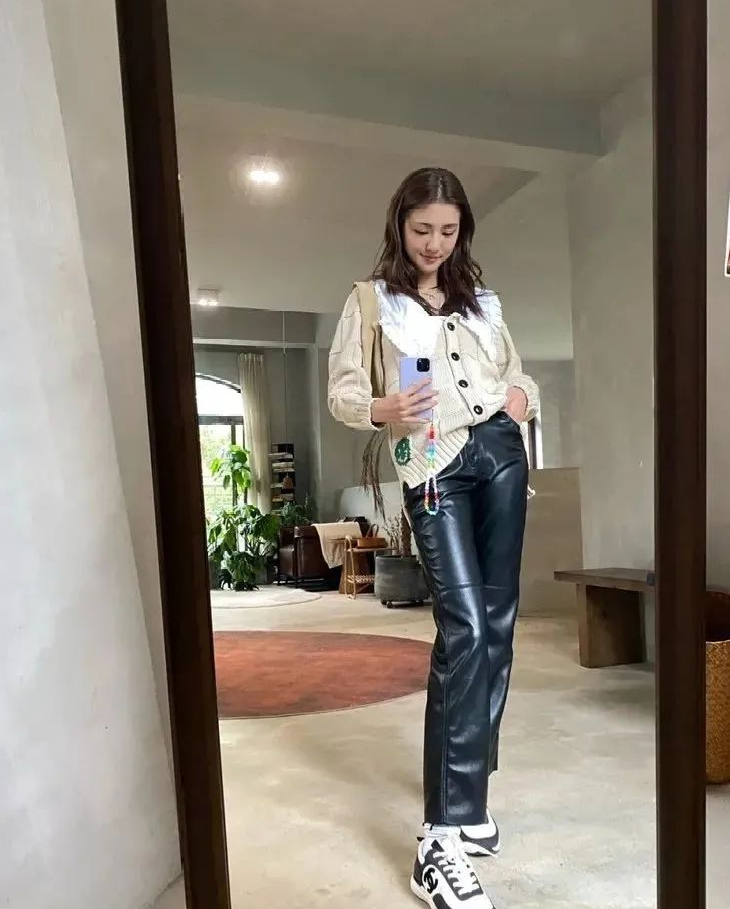 很多人總覺得皮褲太有舞臺感了,不是很好搭配,實際上非也。對於比較柔軟的女生來說用針織衫和皮褲打造柔軟與硬挺碰撞,分分鐘演繹出日常毫不刻意的時髦感,國內不少女明星都是這麼搭配的。