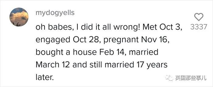 有的網友表示,自己完全沒遵守這三點,「10月3日見面,10月28日訂婚,11月16日懷孕,2月14日買房,3月12日結婚,但17年後依然在一起。」