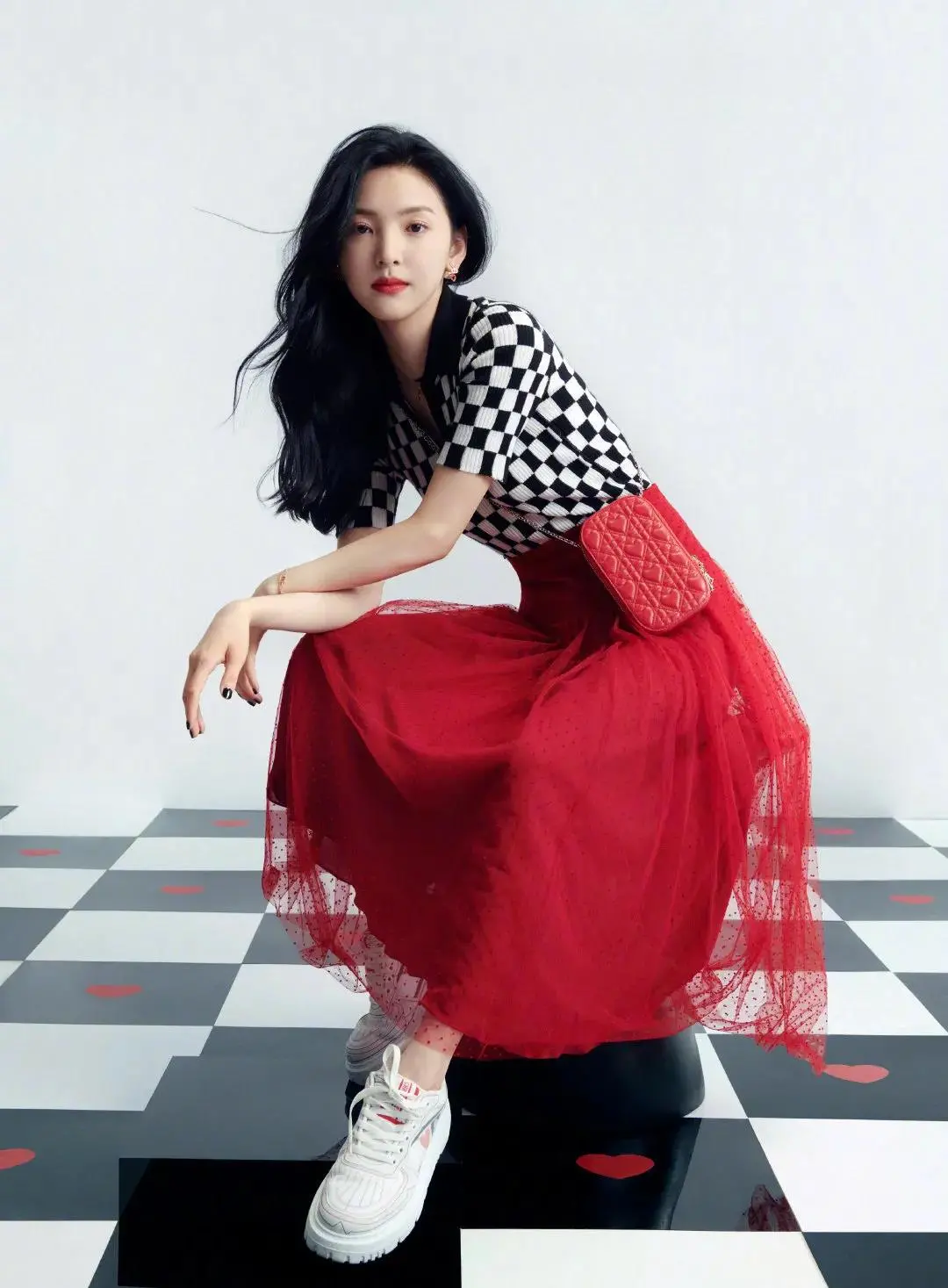 章若楠將Dior棋盤格Polo衫和紅色薄紗褶皺半裙搭配,對比鮮明的兩種顏色搭配在一起感覺在說「雖然我趕潮流,可是我有逼格」。