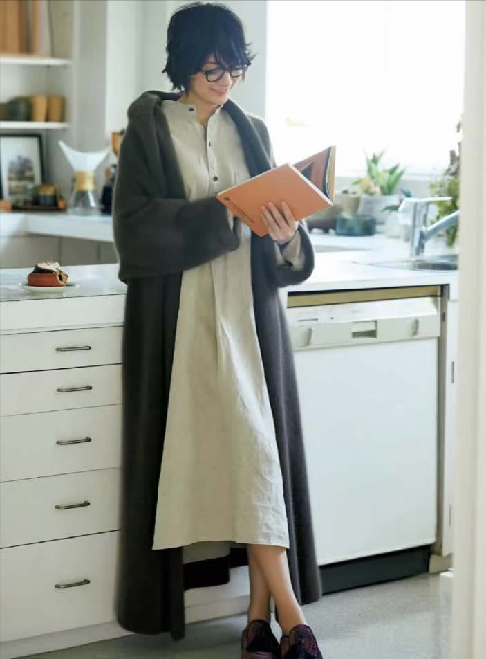 長長的松軟毛衣外套,內搭寬鬆連衣裙,不拘細節,全憑縱向線條的完整而勝出。居家休閒、或者放松時,其樂融融的服飾暖心還暖身。