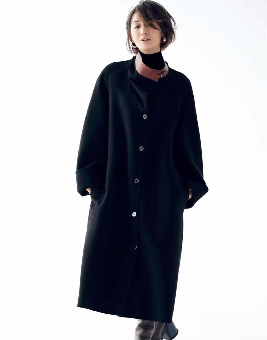 脖頸領口處的一抹棕色,醒目縱向紐扣點綴,灑脫的O版型,制造矛盾反差,是黑色衣服好看的秘訣。