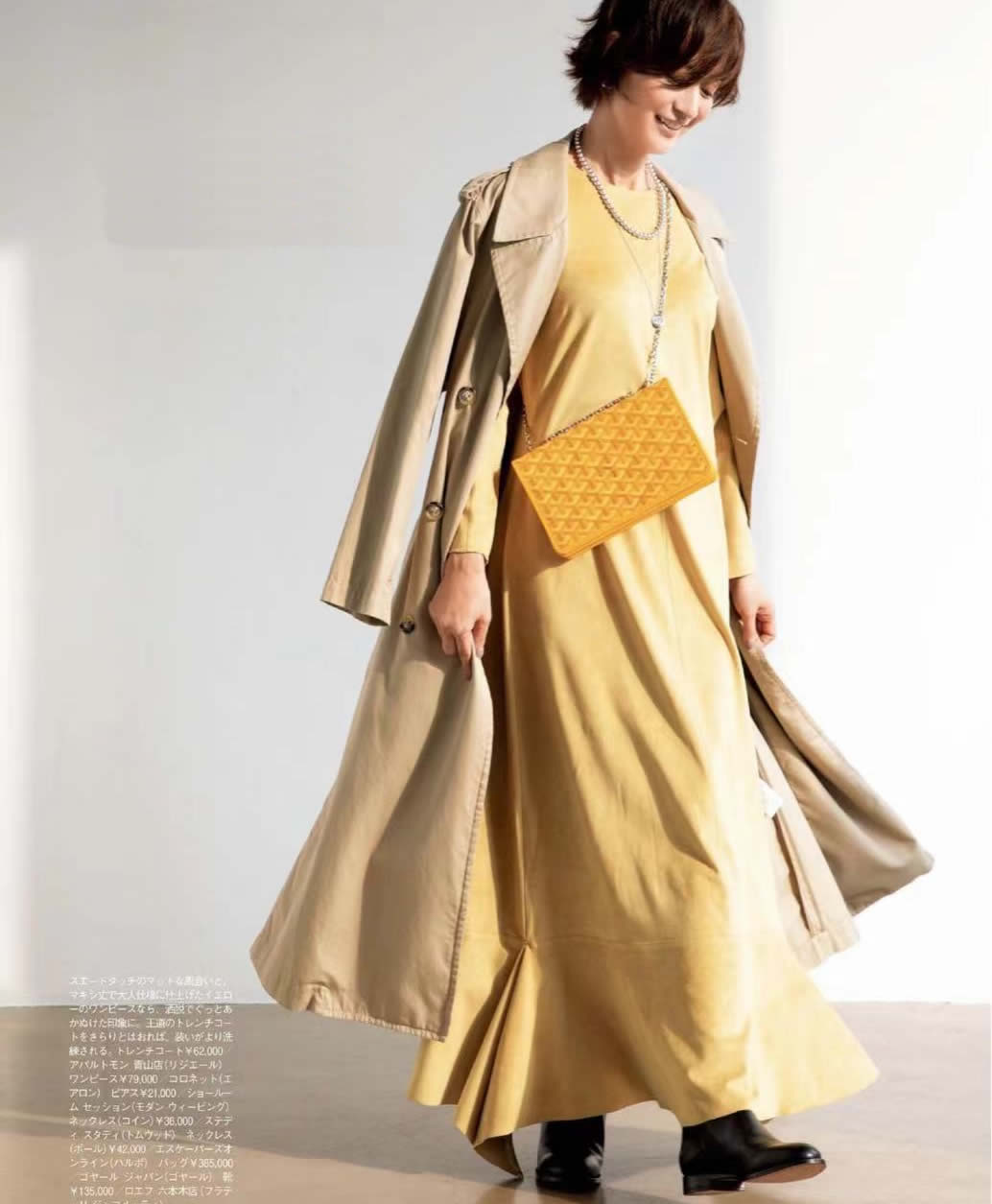 卡其色風衣,內搭黃色長裙,大膽又熱烈。非常考驗膚色的組合,竟能因材質與色調的共同給力而熠熠生輝。