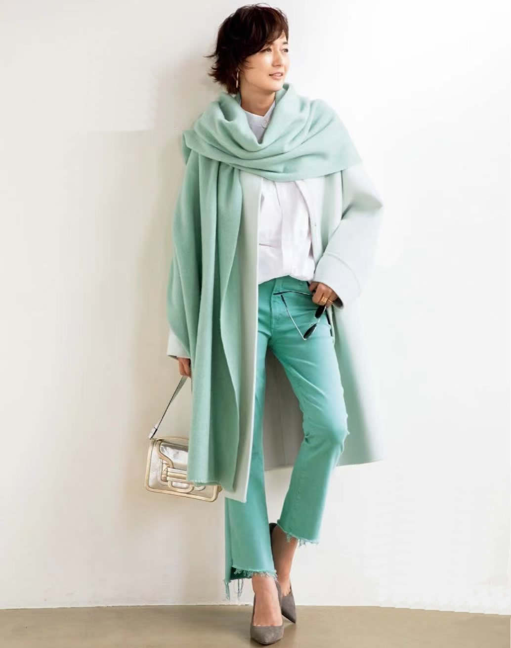 一件淺綠色大衣,也可以是白色,這不重要。關鍵是搭配的綠色休閒褲與長長圍巾營造出的深淺同色調,早將高級定格。不偏激、不過失,自然賞心悅目。