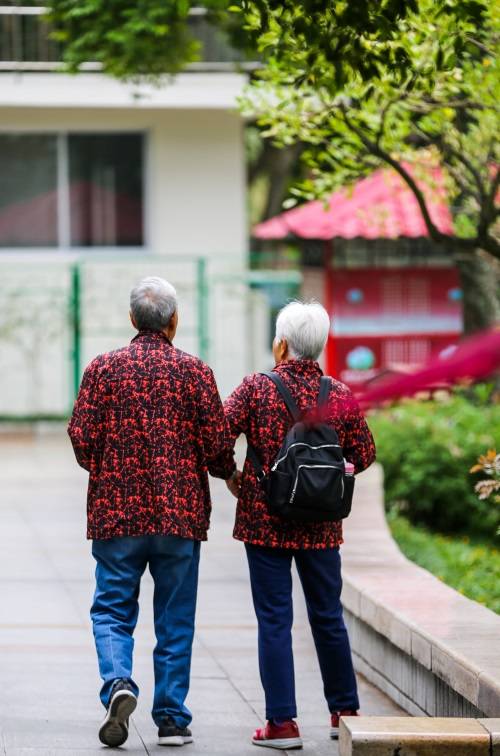 兩位穿著情侶上衣的老人在公園裡散步。南國早報客戶端見習記者遊擁軍攝