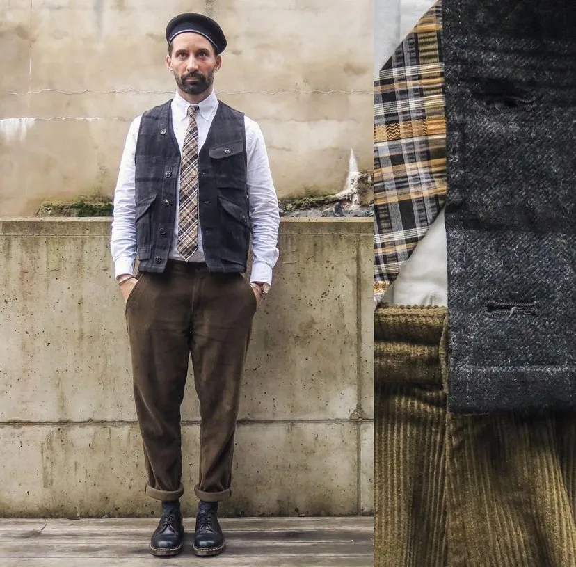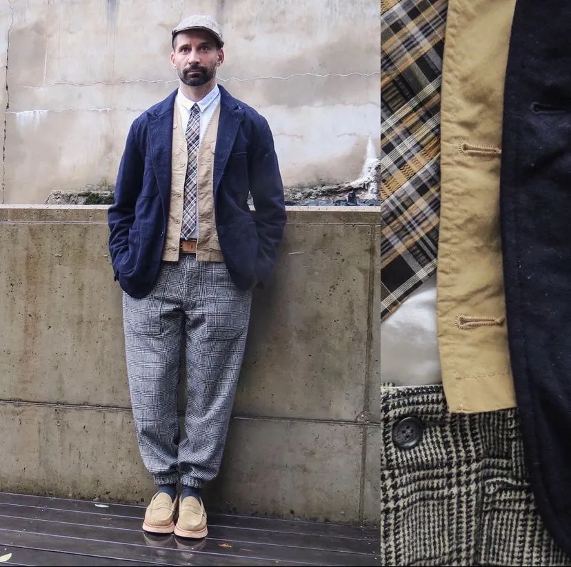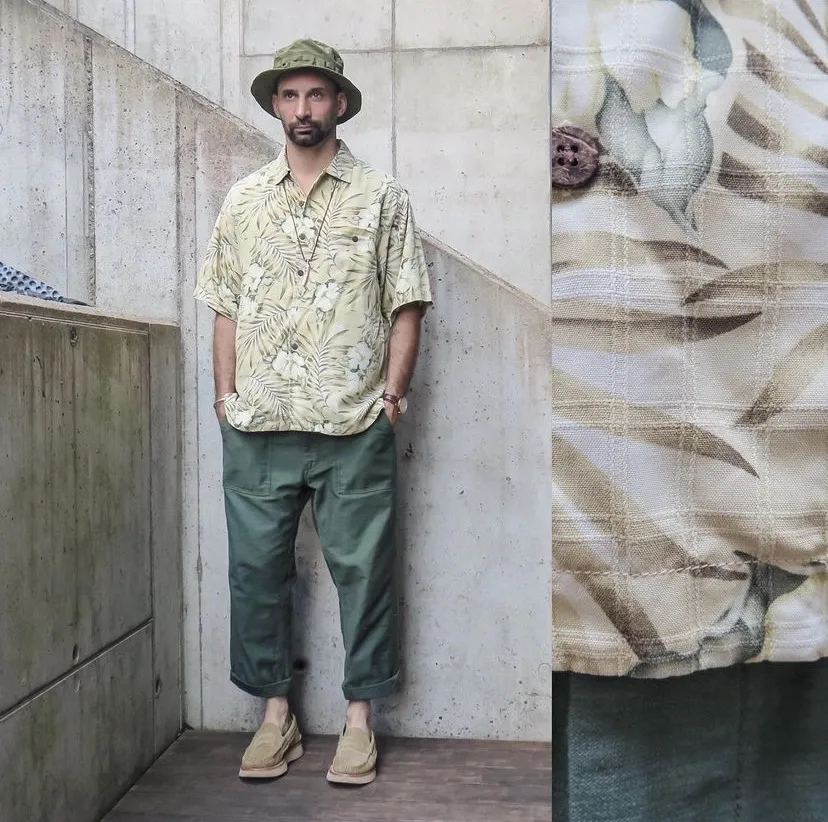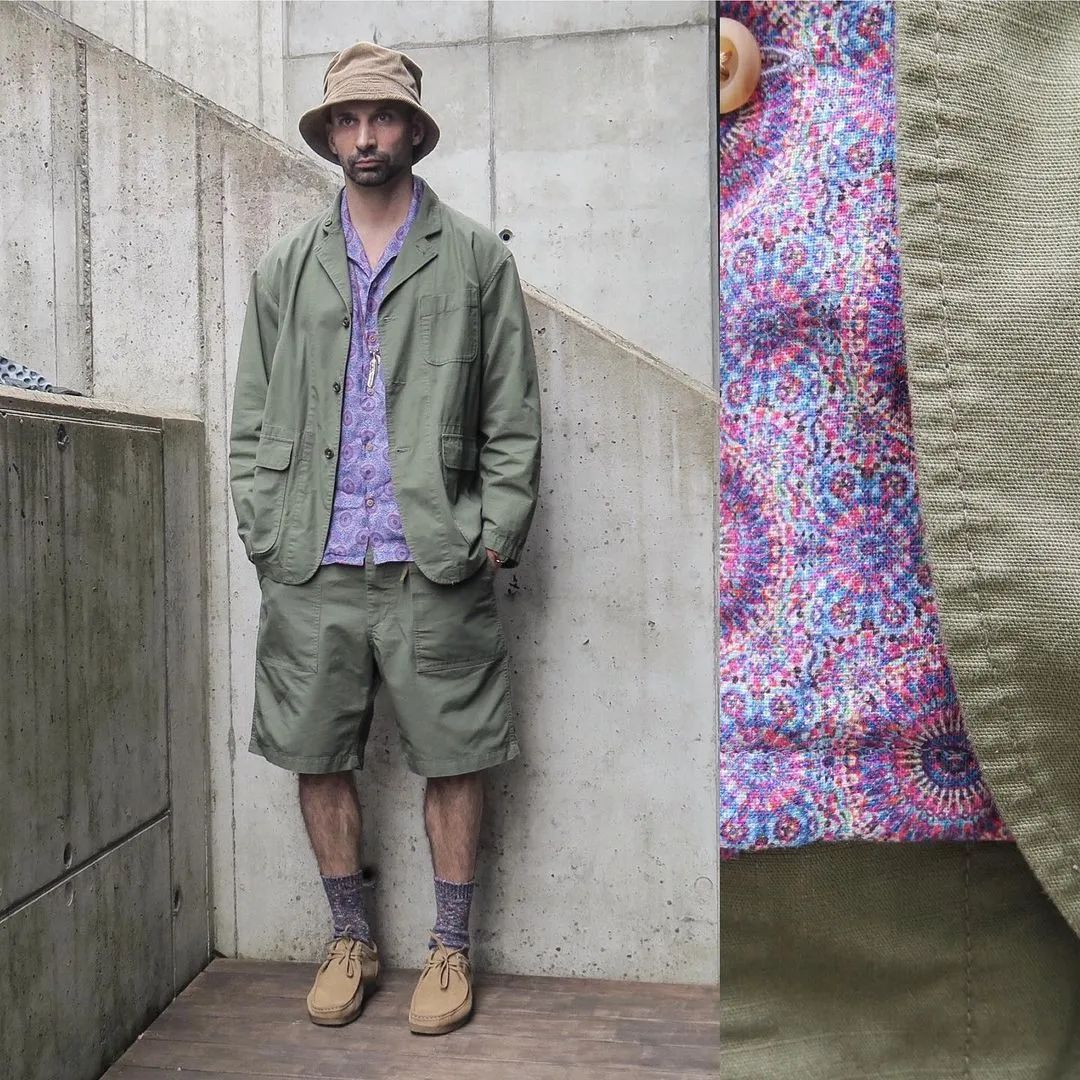 這一套便是一個非常經典的示范,上身和下身都選擇了一件 Engineered Garments 經典的夾克與短褲,單看起來是會有點齋,但內襯選擇了一件花哨張揚的夏威夷襯衫,中和了工裝單品帶來的粗獷感。