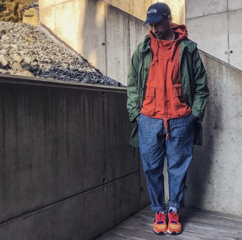 橙色無疑是比較跳脫的一種顏色,但大可不必擔心與紅綠那樣穿成紅綠燈,因為橙色給到我們的是活力,橙綠的穿搭,加上橙色點綴,嚴肅的感覺立馬降低了,適合男士去一些休閒,舒適的場景。