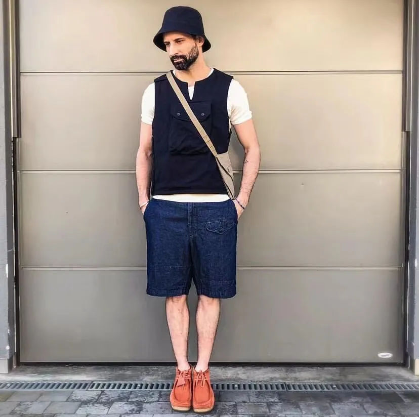 這種純工裝的搭配,經常會用寬簷漁夫帽做一個搭配,但不建議肩膀比較窄的男士選擇,會看起來頭重腳輕。