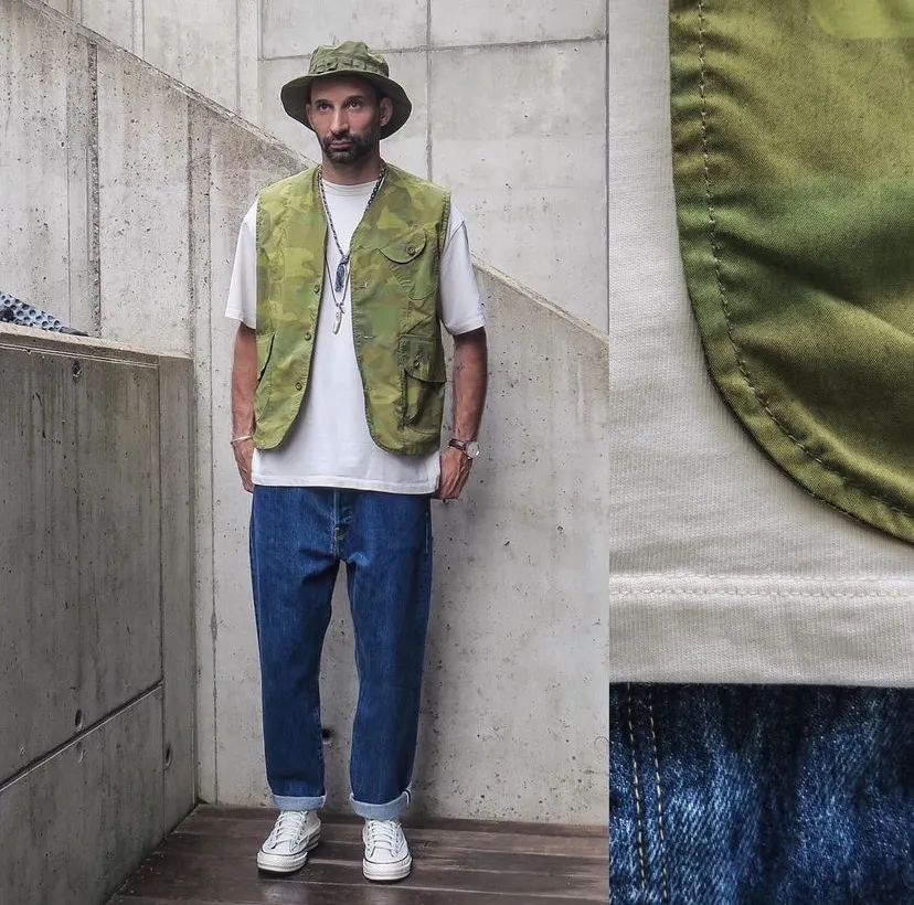 依舊是同樣一件迷彩色的釣魚馬甲,與最經典的白 T 牛仔褲,帆布鞋的搭配,用漁夫帽點綴,綠色成為了最搶眼的顏色,也是讓人驚嘆不已。