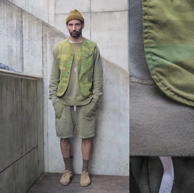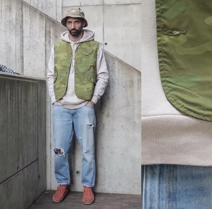 上下同色系的綠色,但重點就在於外面這件顏色稍亮的迷彩馬甲與褐綠色的襪子,整個人的層次感全靠顏色彰顯了出來,是不是非常的神奇。