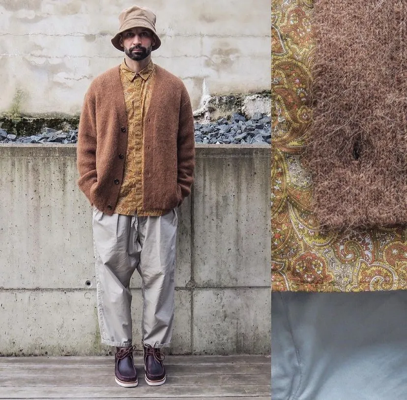 這一套是我個人非常喜歡的,枯草色的針織外套與深灰色的長褲,棕色的鞋子與淺棕色的帽子,既有點西部的氣息,又不會顯得整個人太死板。