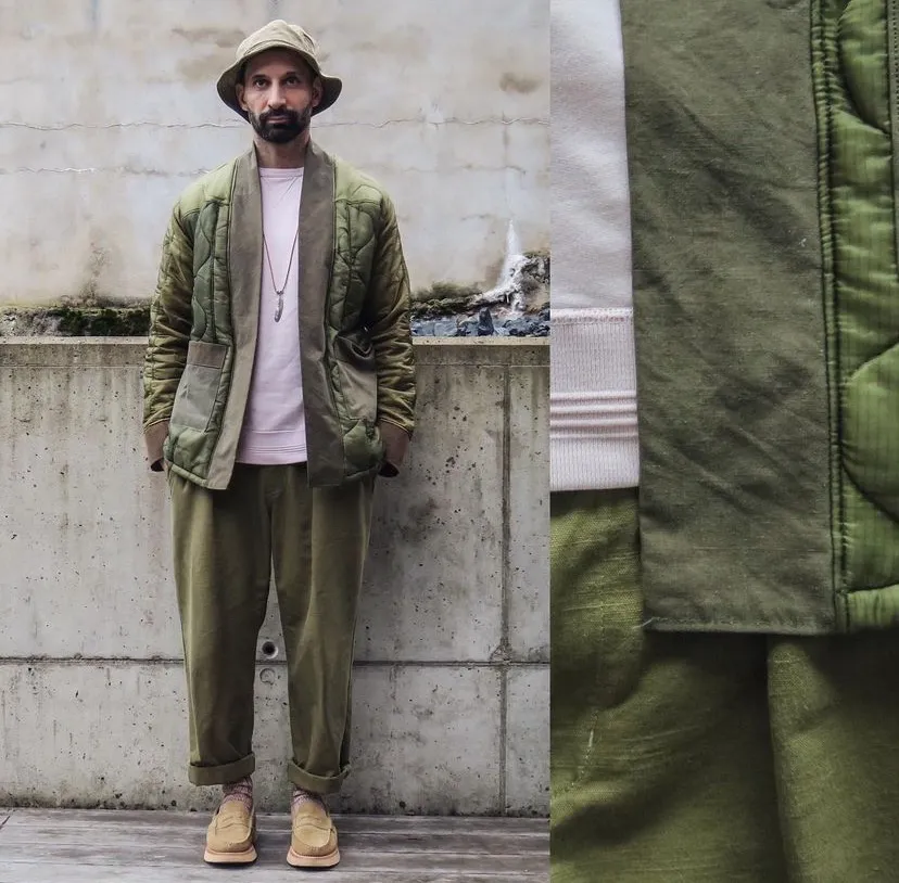 每一次看他對綠色的演繹,我都能感受到一種大自然的清新感,作為工裝風常見的軍綠,能用這種最基礎的顏色穿出質感,真的不是一兩天的琢磨就能實現的,更多的是長時間的搭配來找到屬於自己的專屬配色。