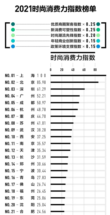榜單將「時尚消費力指數」拆分成了5大一級維度和15個二級維度數據指標,針對4座一線城市、15座新一線城市和其餘18座省會城市展開評估,以此衡量它們的時尚消費能力。其中,5個一級維度分別是優質商圈聚客指數、新消費可塑性指數、時尚潮流先鋒指數、年輕商業創新指數和政策環境支撐指數。