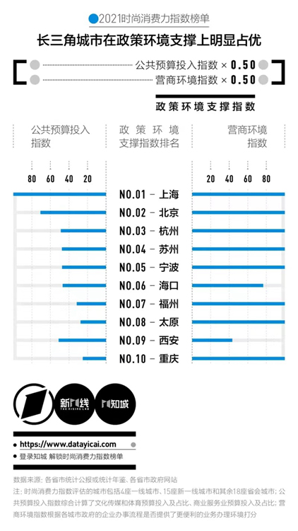 此外,要實現城市時尚消費力突破,需要良好的營商環境和政策支持。長三角城市在這些方面具有明顯優勢。在政策環境支撐指數中,排名前10的城市有上海、北京、杭州、蘇州、寧波、海口、福州、太原、西安和重慶。