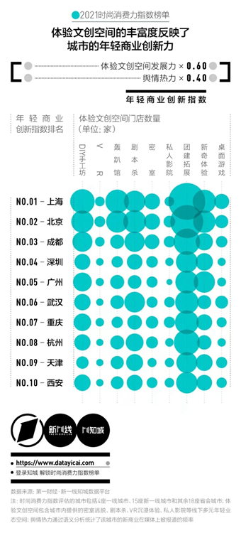 商業創新主要涵蓋劇本殺、密室逃脫、DIY手工坊、VR體驗館等深受Z世代年輕人喜愛的體驗式娛樂場所。年輕商業創新指數可作為城市未來發展的預測指標,反映了城市創新和未來孕育新型商業模式的可能性,通過體驗文創空間發展力、輿情熱力兩大二級指標計算得到。