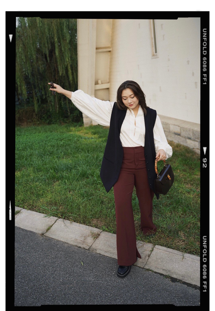 微胖身材不能為所欲為,日常搭配需要保證舒適、顯瘦效果,所以對於微胖女生來說,在整體搭配中多去增添深色系,讓搭配更有優勢。太愛她這也套酒紅色配白襯衣的搭配了,微喇的設計自帶復古氣息,搭配馬甲潮流感十足。