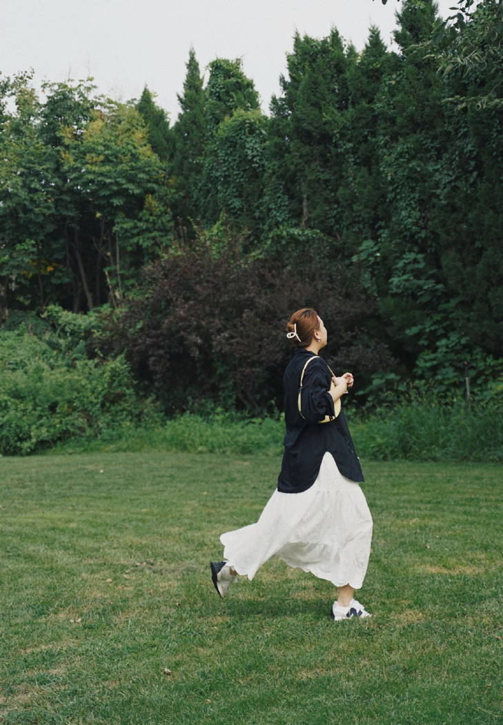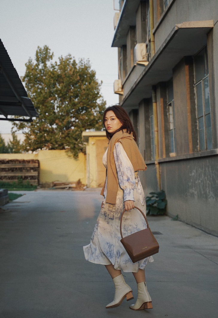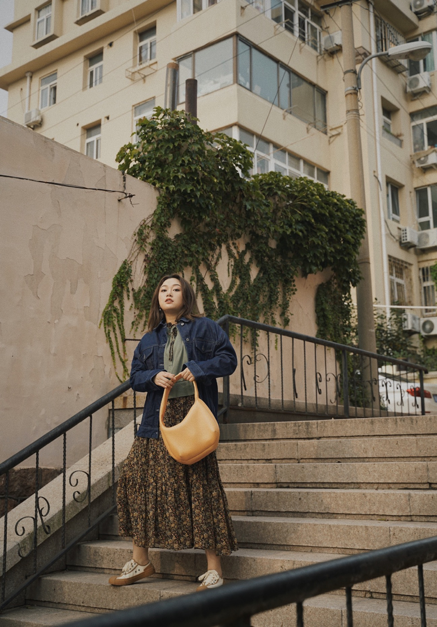 例如說日常的毛衣搭配,可以嘗試深色系毛衣,搭配深色系半身裙,為了避免搭配風格過於枯燥,選擇一款亮色系包包,風格看起來會更時髦。像她這個綠色的毛衣搭配牛仔外套,下半身搭配碎花半裙,既隱藏了腿部的肉肉,又很溫柔。